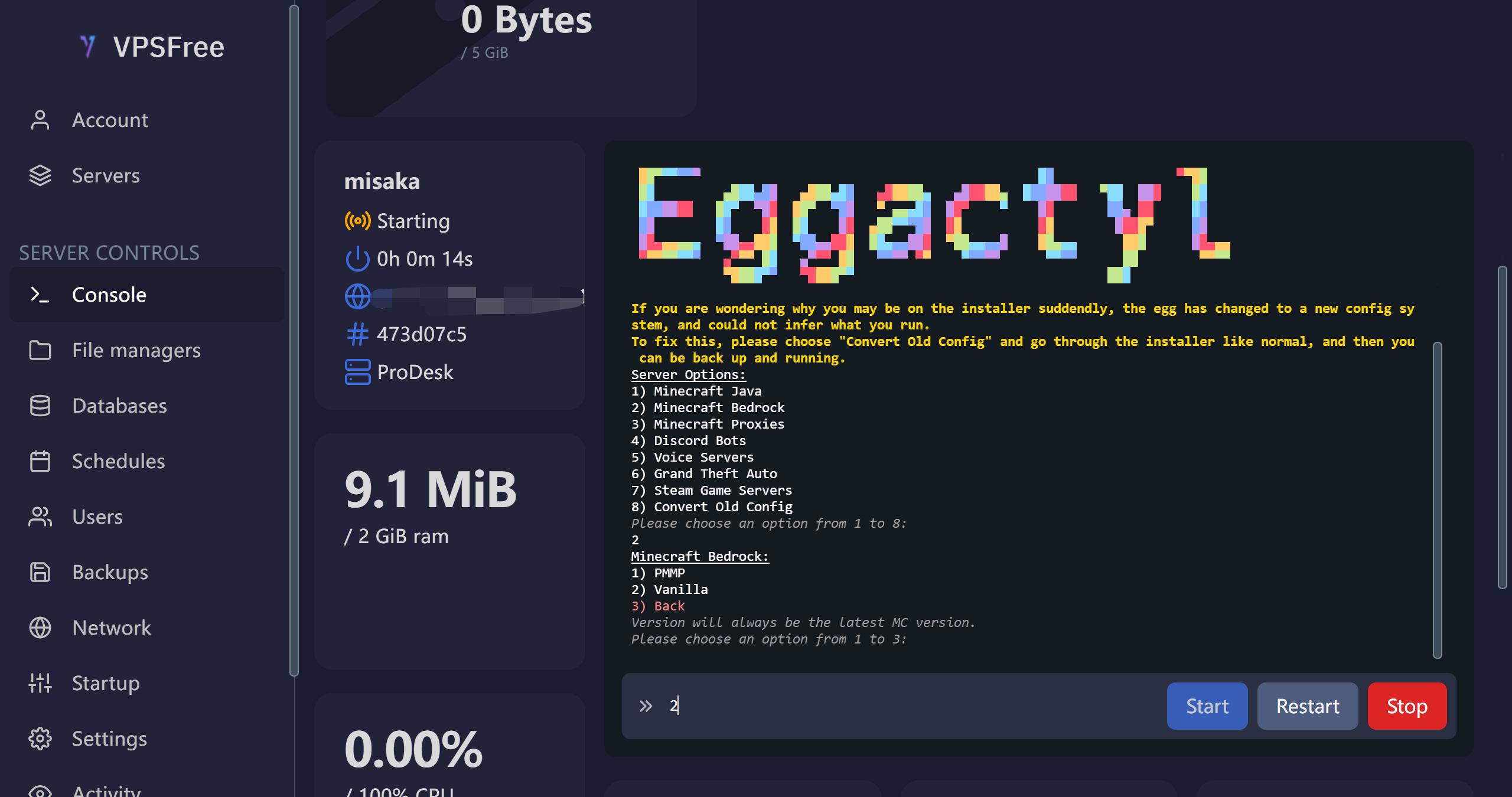 - 先启动容器,然后按照下图输入进行安装 MC 基岩服务器