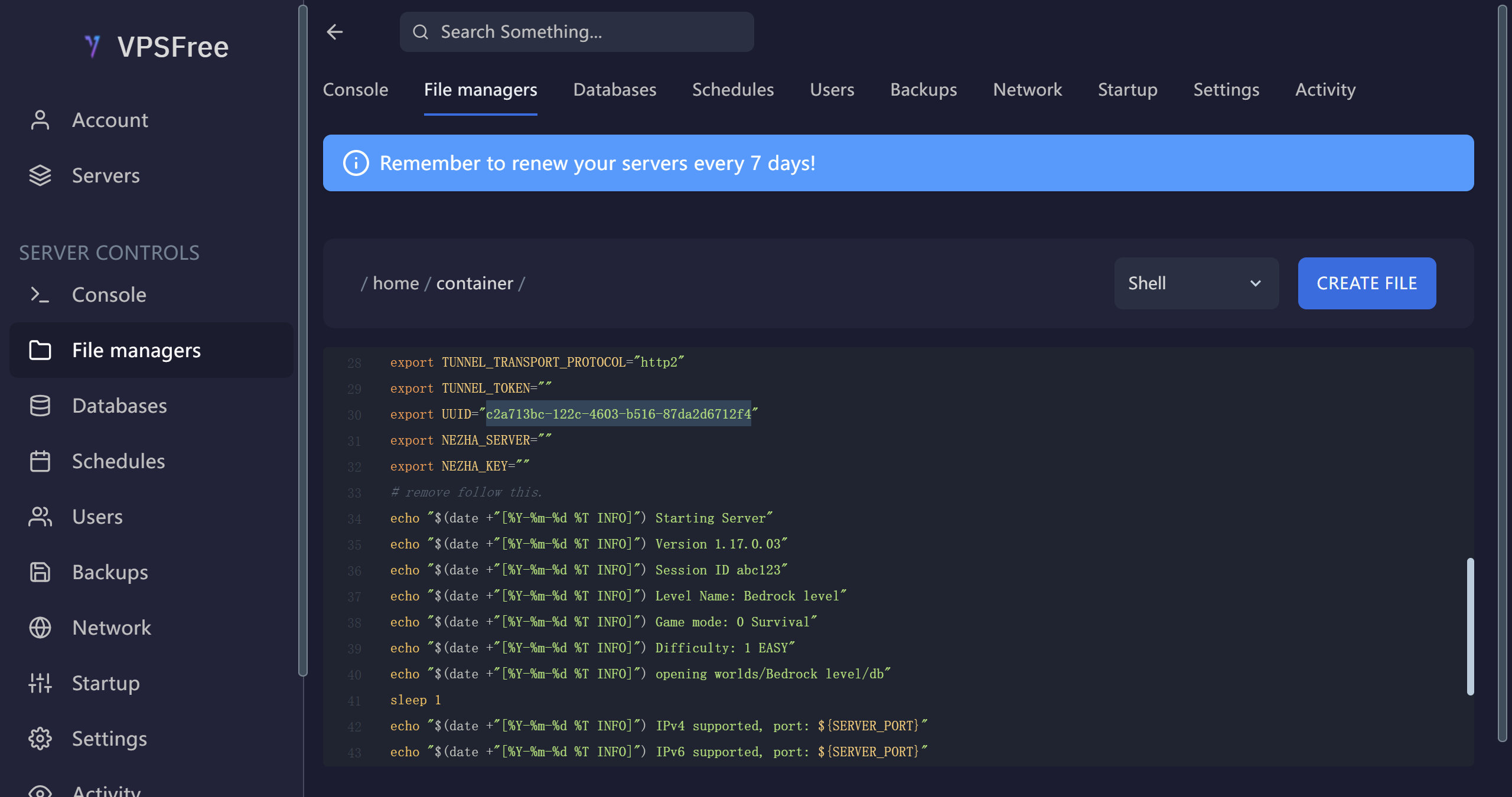 - 创建一个新文件,将 https://raw.githubusercontent.com/Misaka-blog/mc-hosting-vless/main/bedrock_server 的内容全部复制至里面。修改第30行的UUID,文件类型选择“Shell”,点击“Create file”按钮,输入名